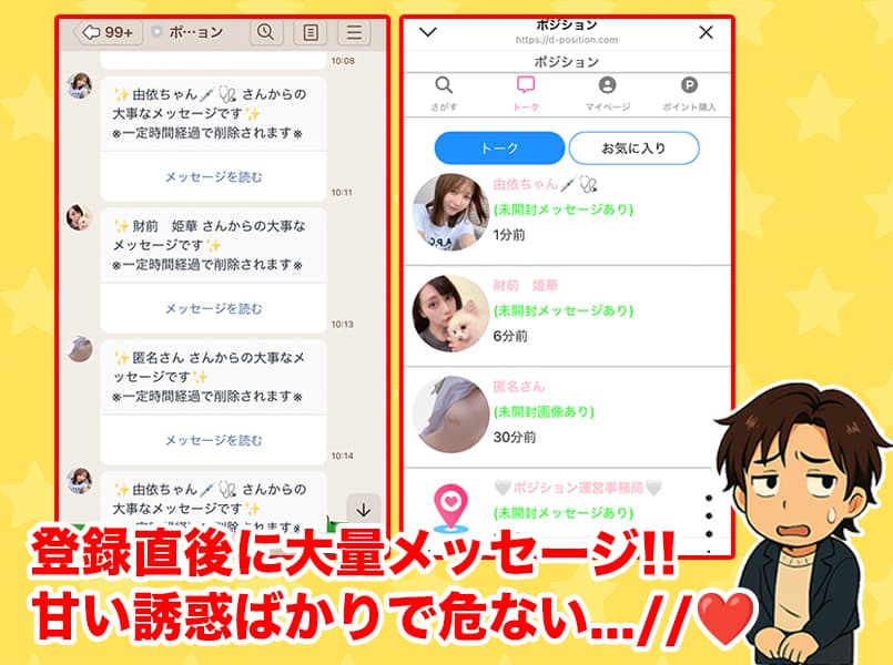1. 登録直後に大量のメッセージ=サクラの可能性大