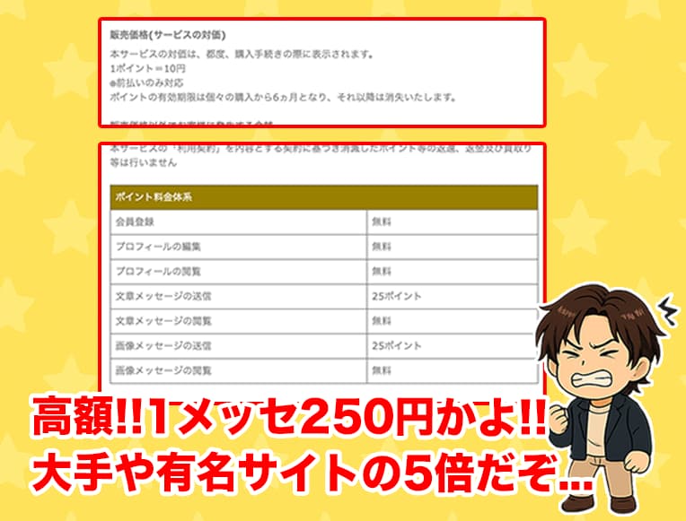 登録は無料だけど、メッセージ送信は1通250円。やり取りを続けると簡単に数千円〜数万円になる。俺も実際に試してみたけど、すぐポイントが溶けていったよ。
