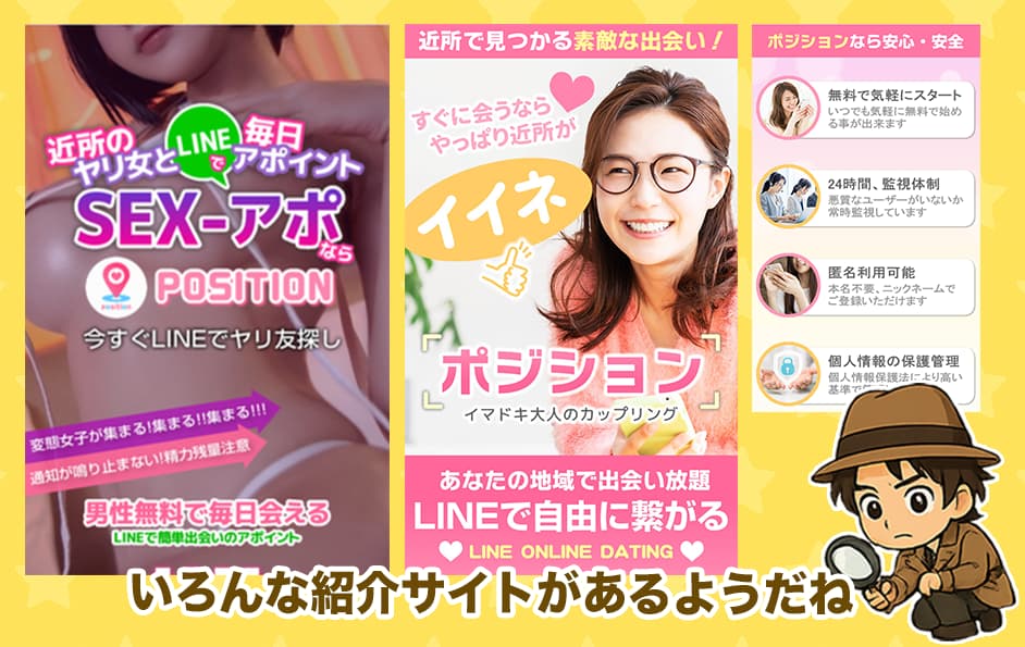 ポジション(POSITION)は、「近所で出会える」「大人のカップリングが楽しめる」と宣伝している出会い系サイトで、LINEで近所の人と自由に繋がれるをコンセプトにしているようだね。