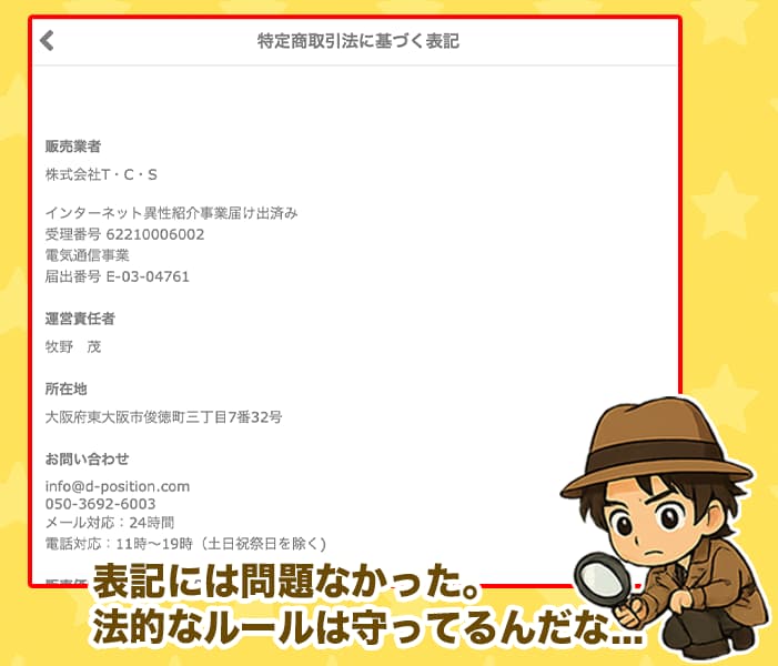 実際にポジション(POSITION)の特定商取引法を確認してみたところ、 インターネット異性紹介事業の受理番号の記載があった。