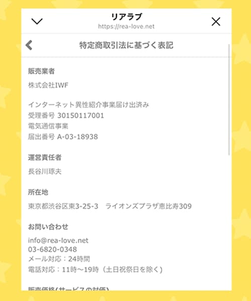 特定商取引法のページにも、運営会社「株式会社IWF」、住所、電話番号などの記載はあるものの、責任者の顔や実態が分からない。