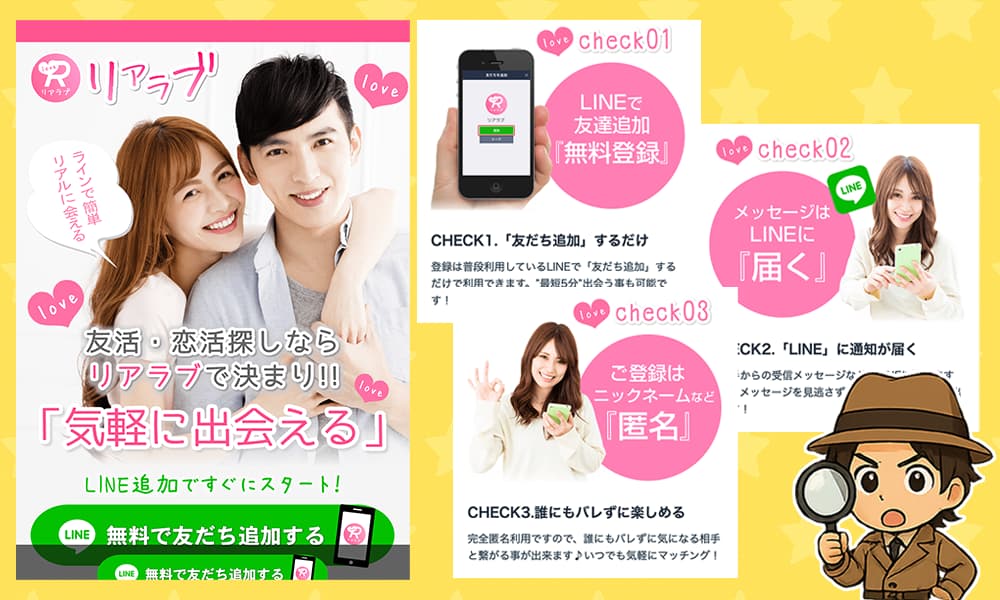 「ラインで簡単」「友活や恋活ならリアラブ」「匿名で誰にもバレずに楽しめる」などの特徴があるようだね。