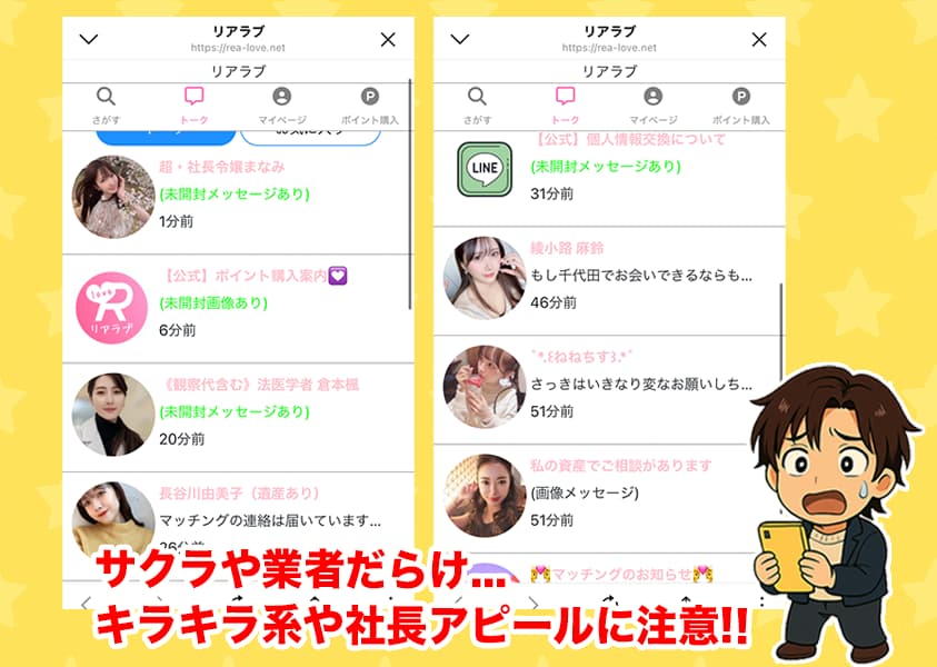 - 登録直後から大量のメッセージが届くがサクラや業者だらけ