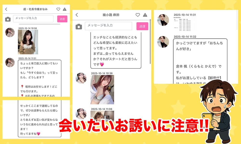 また、中には「こっちのLINEで話そ」「こっちのサイトに行こうよ」といったメッセージも多く、外部SNSへの誘導もあるからかなり危険だな。