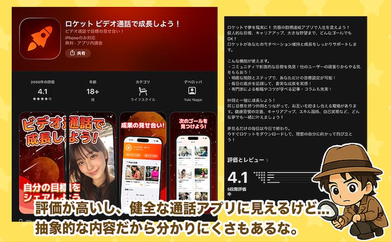 今回ロケットのアプリの情報を確認すると、出会いや通話の実態がある一方で、法的な表示や運営情報が不明瞭だった。