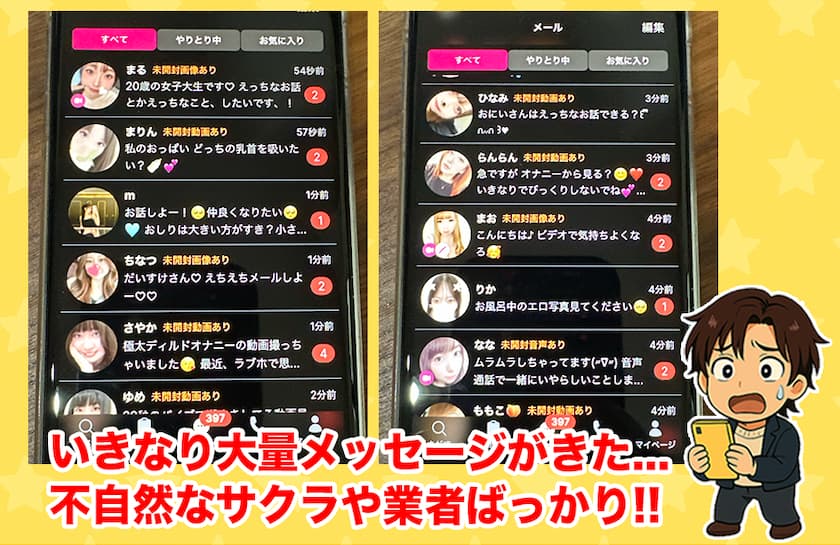 - 大量メッセージが届くがサクラやチャットレディからの誘惑ばかり!