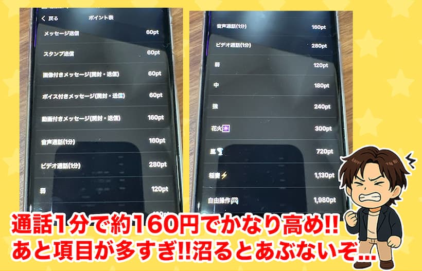 ビデオ通話の場合は1分280ptだから、1分あたり約350円なんだけど、全体的に高額だぞ!