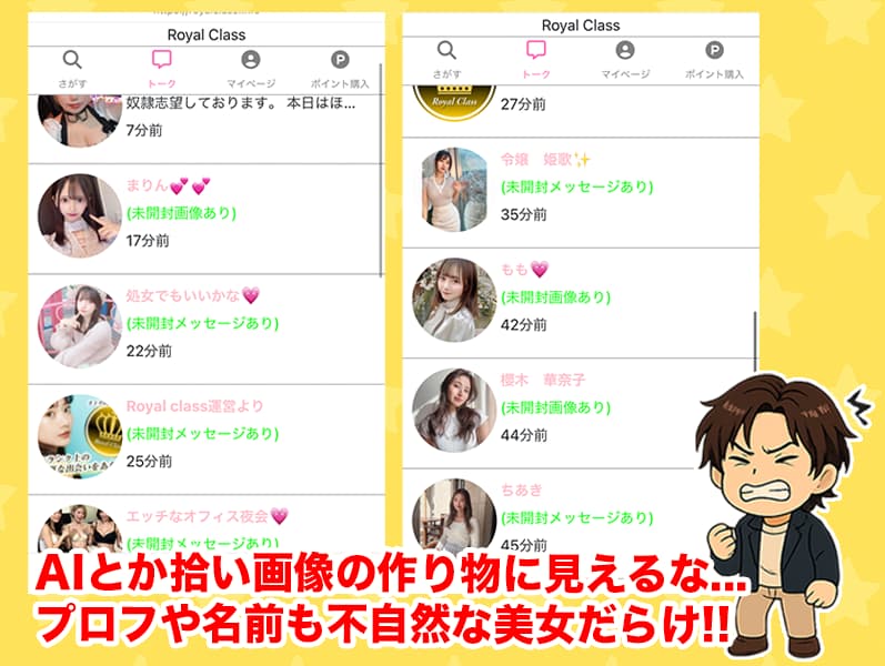 今回相談が来たから俺も使ってみたけど、ロイヤルクラス(RoyalClass)には大量のサクラが潜んでいたり、かなり怪しい実態が潜んでいました。