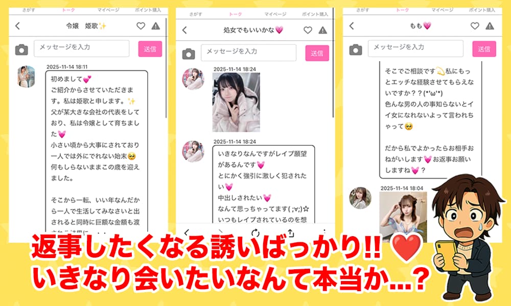しかも、全員が「今すぐ会いたい💕」「ホテルで話そう?」みたいな、明らかに現実離れしたテンションで誘ってくる。