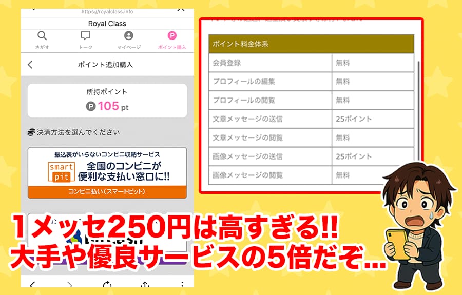 改めてロイヤルクラスの料金は、メッセージ送信1通につき250円が必要なため、こうした甘い誘いや写真を送ったりしながら、メッセージのやりとりを引き延ばして課金消費の温床にしていることが多いぞ。