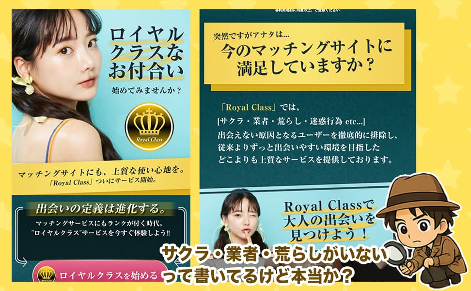 「ロイヤルクラスなお付き合い」「ロイヤルクラスなサービス」ってことが特徴だと紹介されているけど、本当なのかは怪しいところだよな。