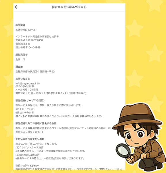 次は、ロイヤルクラス(RoyalClass)の「運営情報」や「異性紹介事業の届出」など、法的な部分をしっかり調べていくよ。