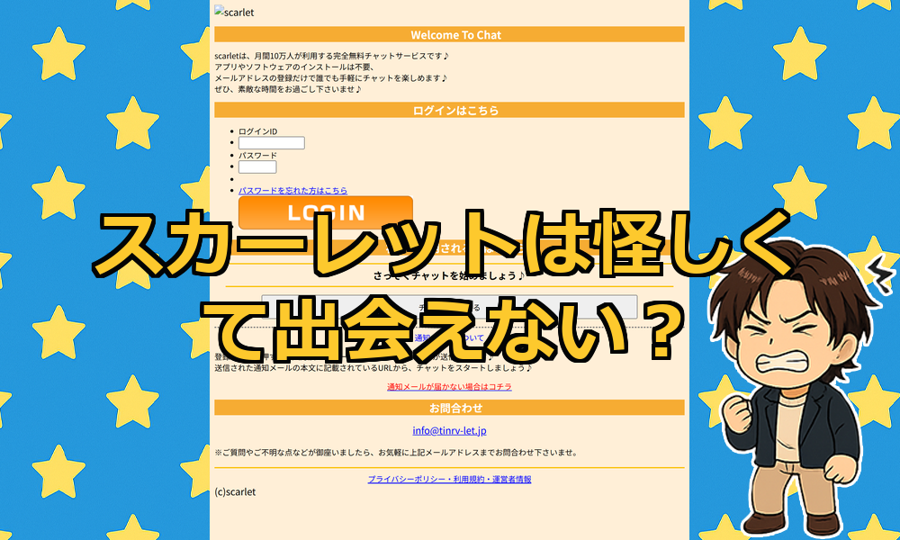 今回のスカーレット(scarlet)も「完全無料」「メール入力だけで使える」って紹介された謎の掲示板、明らかに怪しい印象を受けるよな。