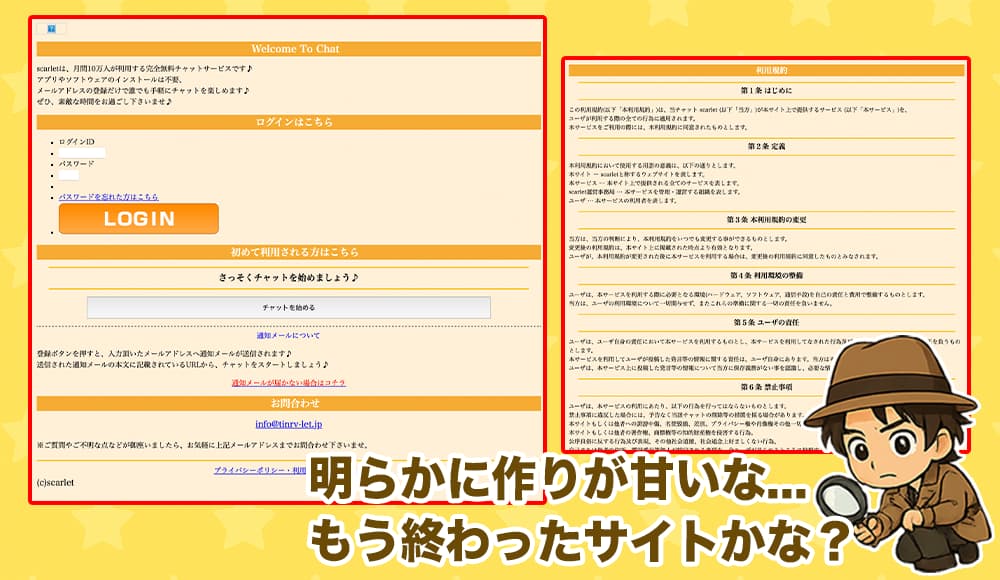 このように運営者情報や利用規約は書かれているが、運営元が「scarlet運営事務局」となっていて所在も不明だね...。