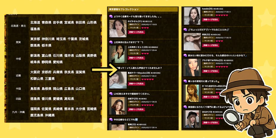 また、セフコレを始めるには、地域と好みの相手を選んで連絡するだけってことだけど、