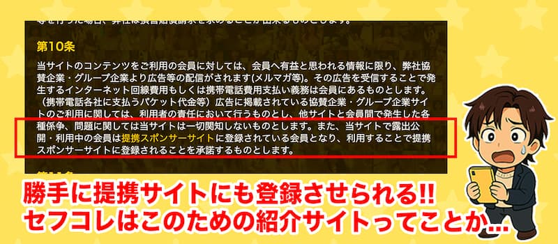 セフコレの利用規約にも、提携スポンサーサイトに自動登録される旨の記載もあって、やっぱり無料から高額サイトに誘導するための仕組みっぽさがさらに濃いね。