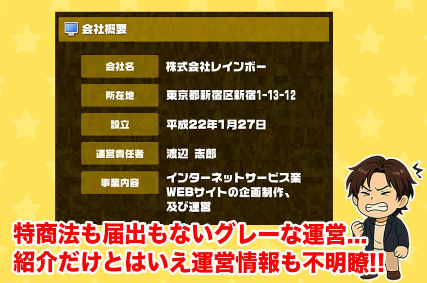 - 年齢認証と本人確認がなく運営情報も不明瞭で信用できない!