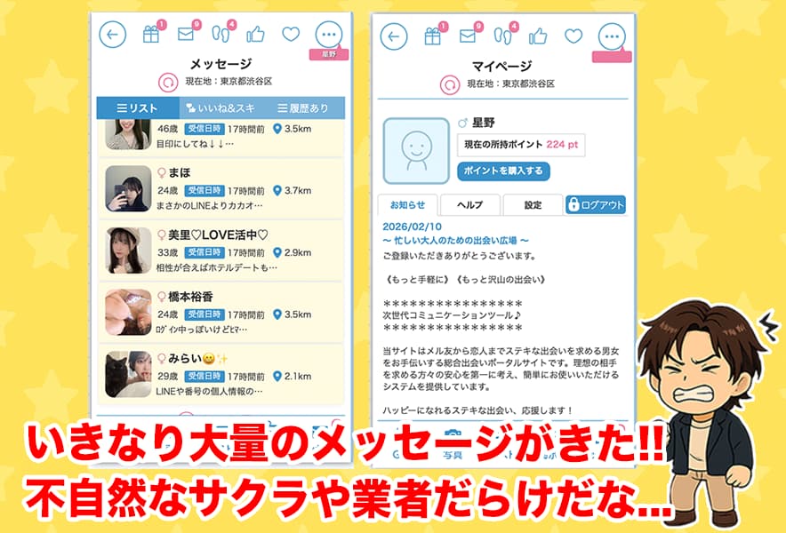 - 登録直後からメッセージが大量に来てサクラっぽい