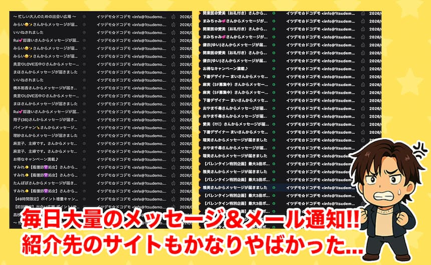 さらにやばかったのが、セフレゲットに登録した直後から、自動的に登録させられていたイツデモ☆ドコデモから、大量のメッセージとそのメール通知がドドドって届いたよ!💦