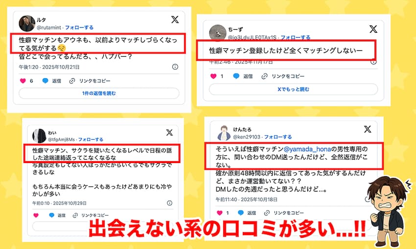XなどのSNS上でも、「性癖マッチン入ってみたけど全然マッチしない」「期待しすぎた」みたいな投稿が多かったな!