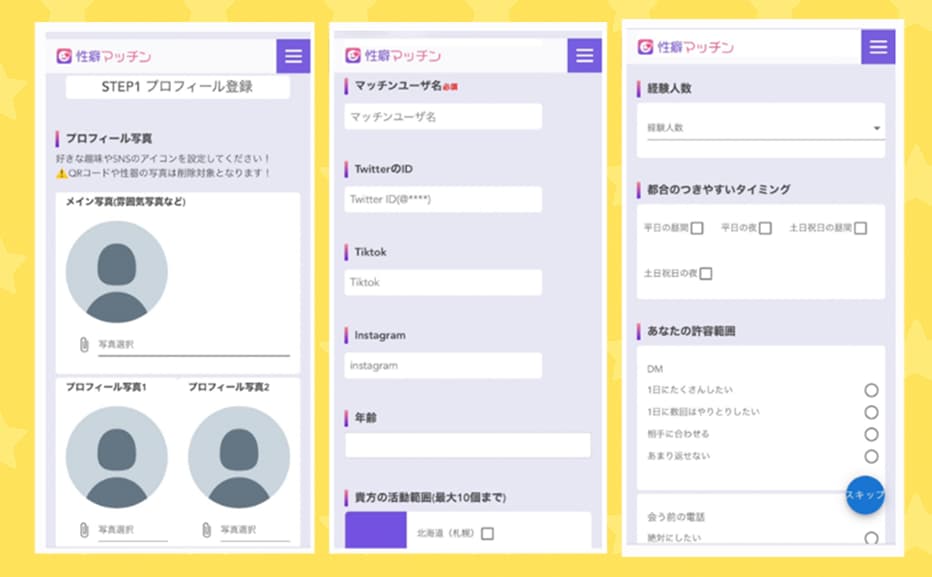 実際の流れとしては、会員登録後に年齢確認を行い、プロフィールと性癖を細かく入力します。