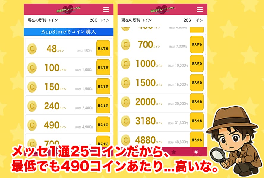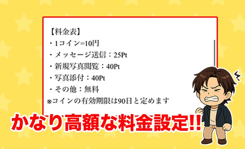 ただ、料金体系は1コイン=10円で、メッセージ送信に25Pt、新規写真閲覧に40Ptといった高額な料金設定が目立つね。