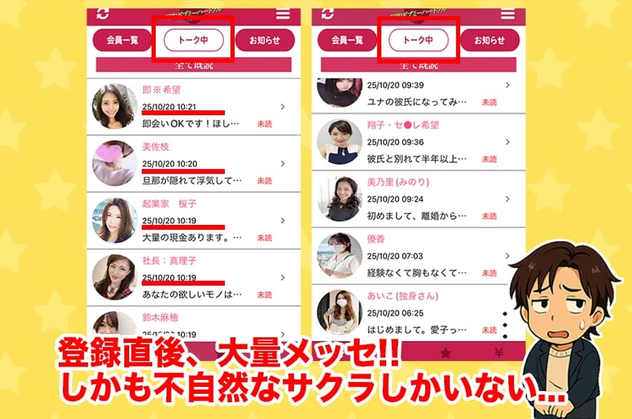- 登録直後に大量メッセージ=サクラや業者だらけ!