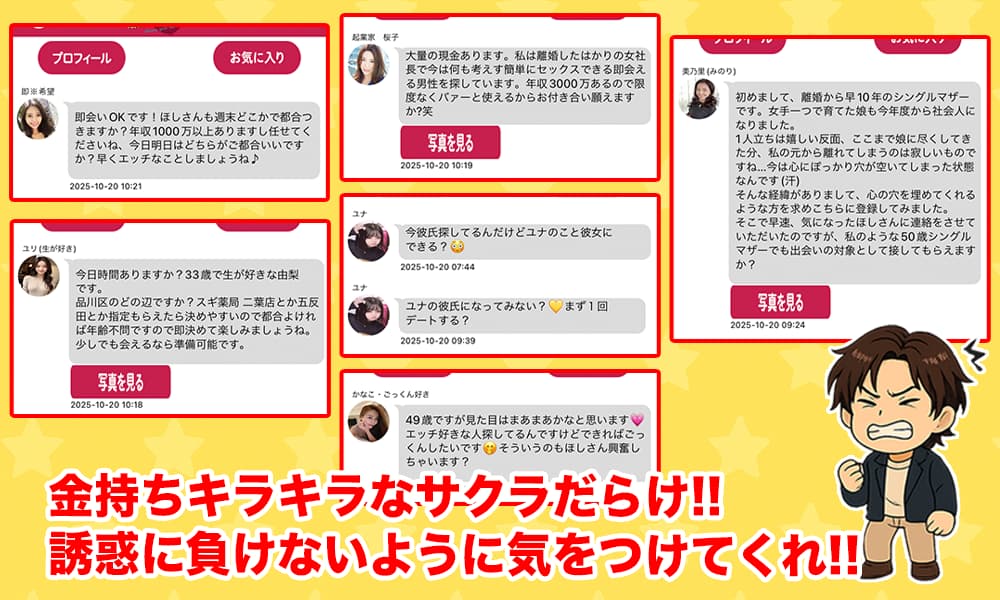 間違いなくサクラの可能性が高いから、えちなお誘いには気をつけてくれ!