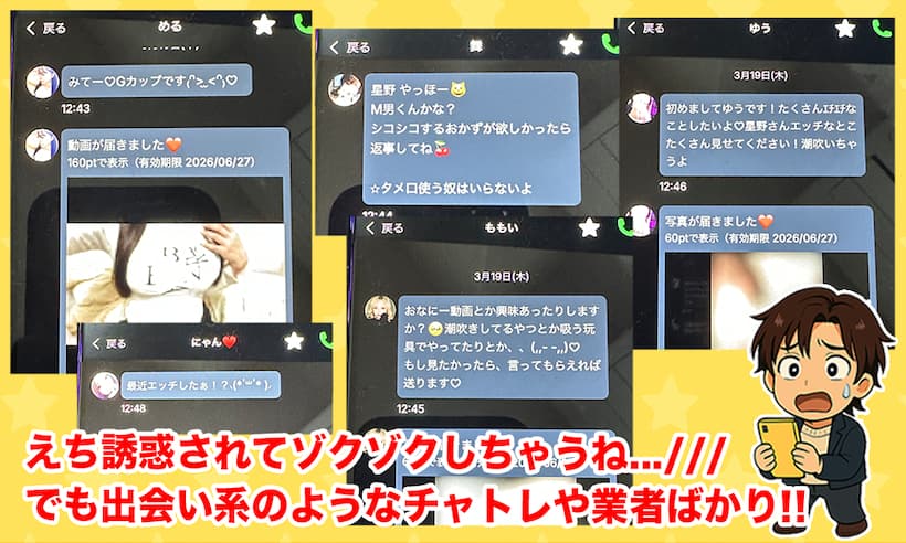- 登録直後からチャットレディや業者まがいの連絡が大量に届く