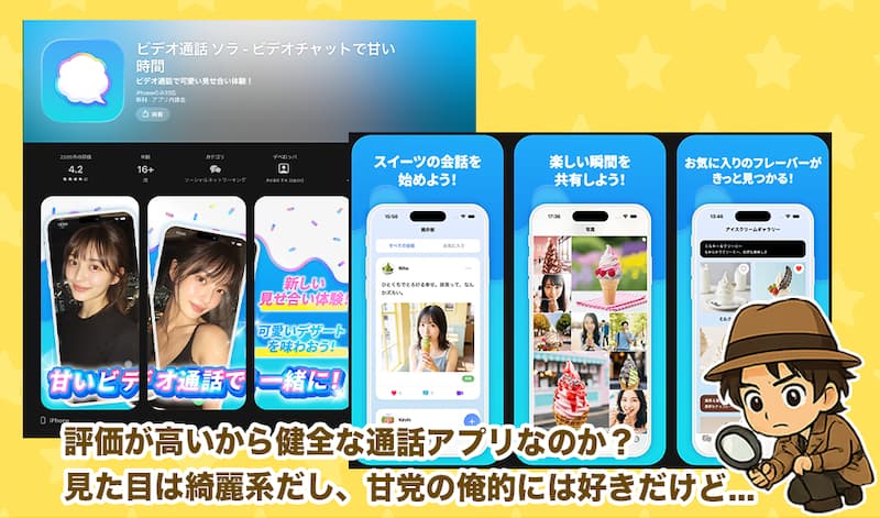 SORA(ソラ)の通話アプリは、好きなアイスを見せ合うような紹介をされているけど、その裏ではチャットレディやサクラによる高額課金を狙う、怪しい実態が潜んでいたぞ!💦
