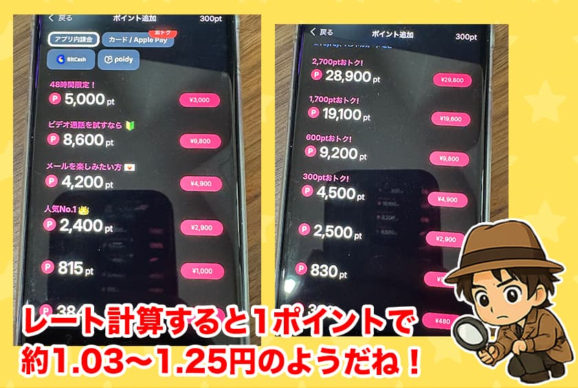 星野俺が見たときは、48時間限定の5,000ptプランがあって、これは1ptあたり約0.60円とかなり割安なので、サービスの質が良ければお手頃価格だから始めやすいね。