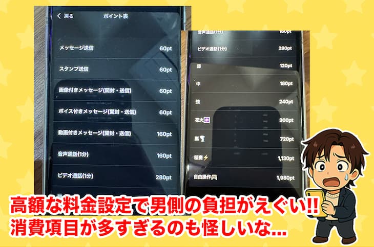 スタンプ送信や相手へのリアクションにもポイントが必要になるから、課金ポイントが多いのも気がかりだね。