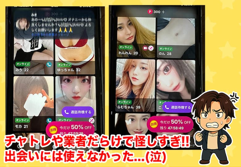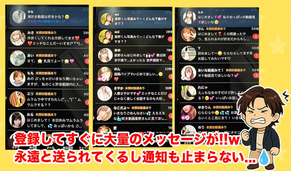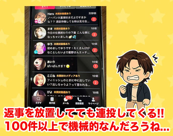 - 登録直後から大量メッセージが届くが、チャットレディや業者だらけ