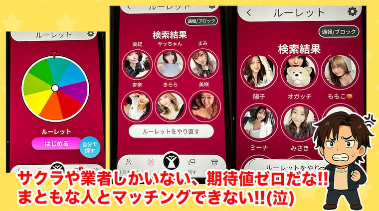 登録直後から不自然なくらい女性からメッセージが届くとか、会話がかみ合わないとか、会えそうで会えないとか、まさにサクラ運営アプリの典型パターンなんよ。(^^;;