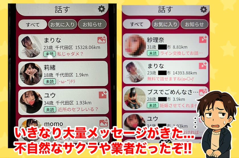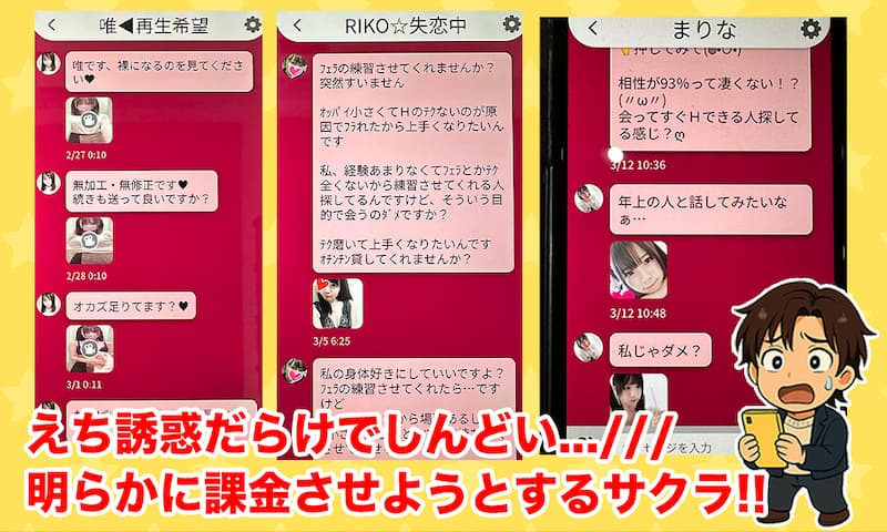 - サクラや業者が多い!甘い誘惑に沼ると課金地獄や誘導にハメられる