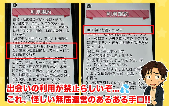出会い系アプリとして使おうとしているのに、届け出の有無が見えない、住所もない、規約では出会い目的を禁止している、これはかなり危ない組み合わせだったね...💦