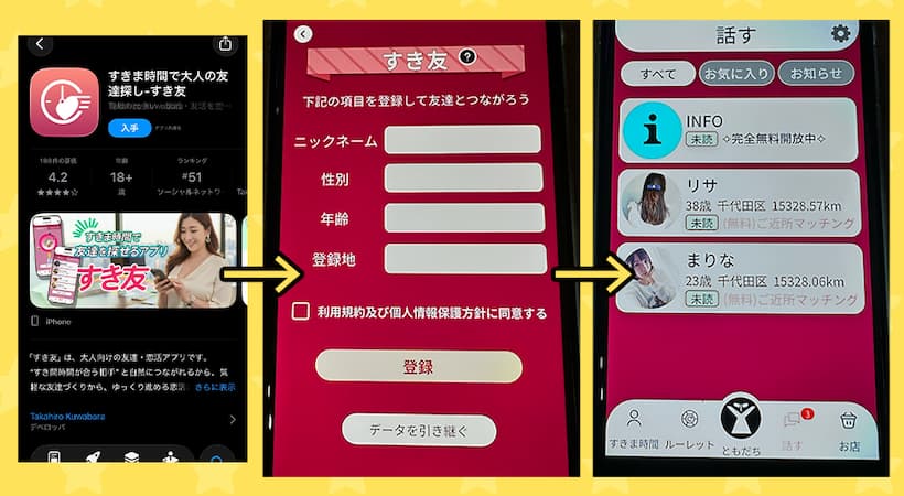 次は俺が実際にすき友アプリへ登録して、年齢確認の有無やサクラ・業者の実態を検証していきます。