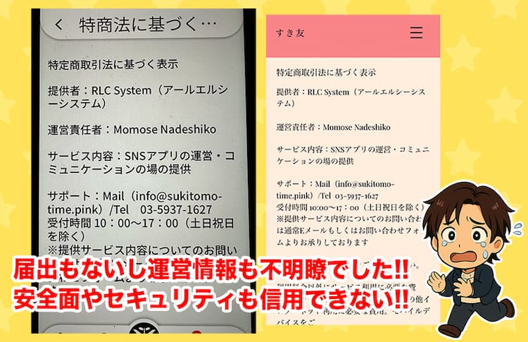 次は、すき友アプリに異性紹介事業の届出があるのか、それと運営情報に不審な点がないかを見ていくぞ。