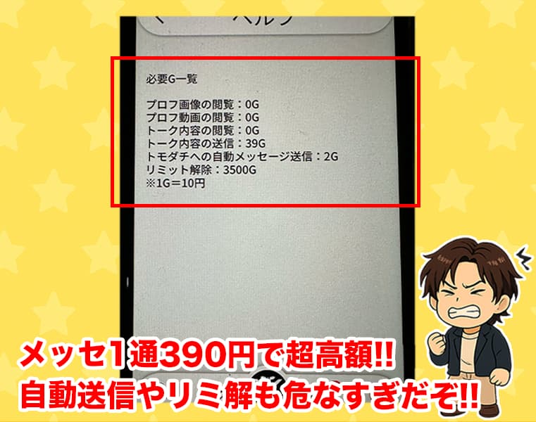 トーク送信は1通39Gだから、1通390円ってことになる。