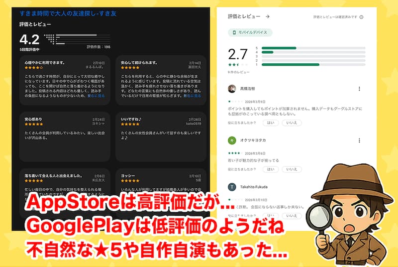 次は、すき友アプリの口コミや評判を調べて、俺の検証結果と世間の声が一致しているのか見ていくぞ。