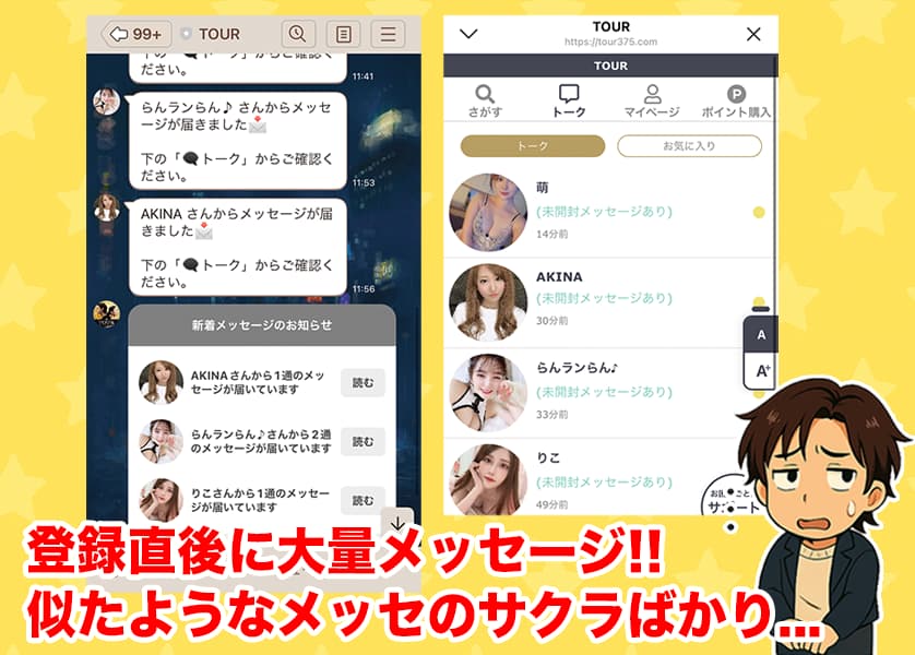 - 登録直後からサクラ疑惑の大量メッセージが届く