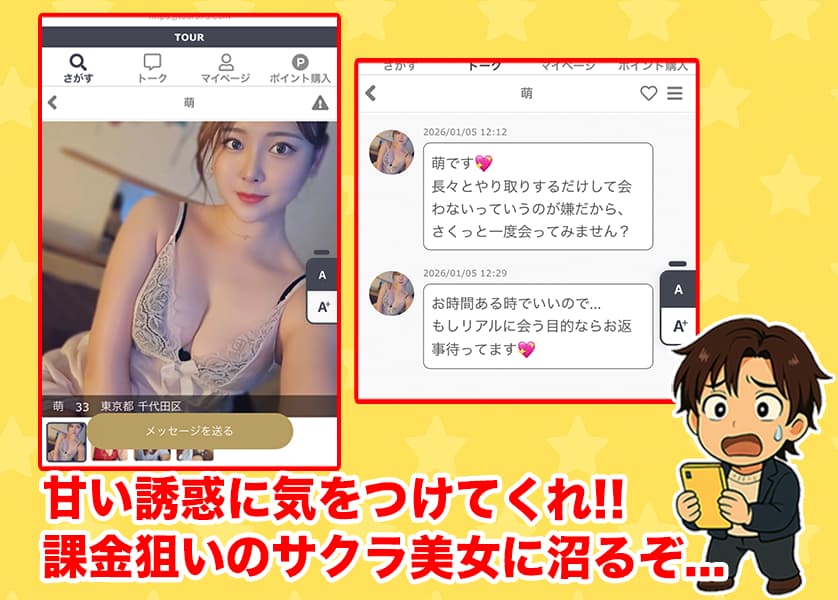 やり取りを続けても、最終的には出会えることなく、サクラ女性の誘惑に沼ってしまって高額課金にハマる可能性が高いから気をつけてくれ!