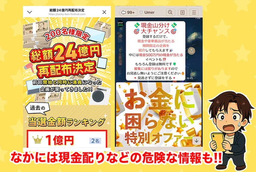 「お金配り」とか「現金山分け」とか「1等当選」のキャンペーン情報にはくれぐれも近づかないようにな!