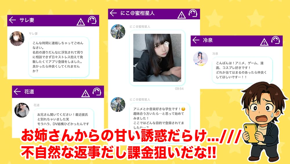 - 登録直後から大量メッセージで会話が噛み合わずサクラ運営の疑いあり