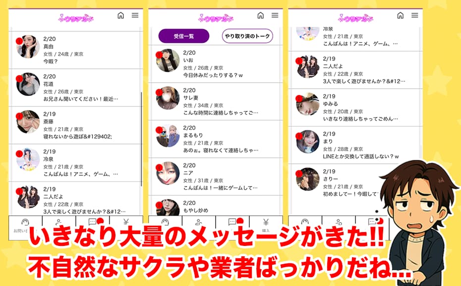 - 登録直後から大量メッセージでサクラ運営&課金地獄にハメられてしまう