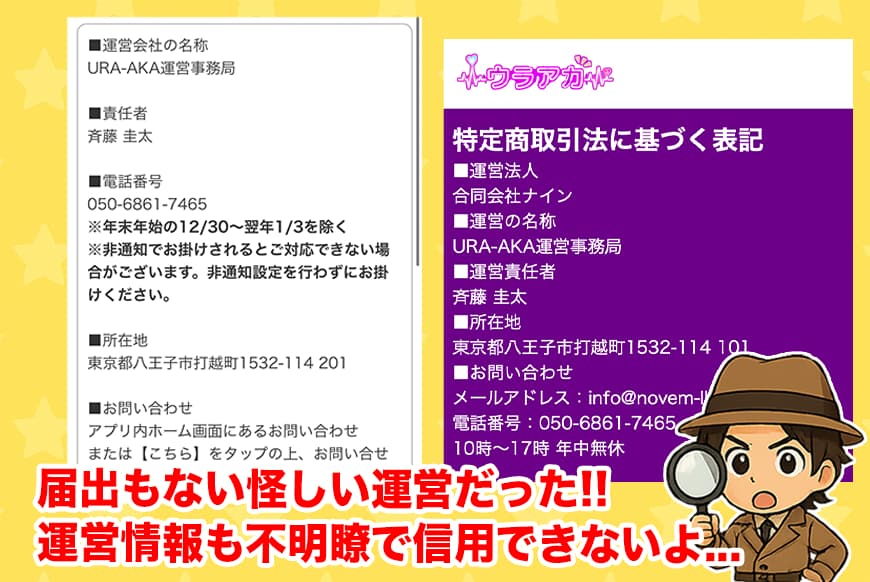 じゃあ次は、ウラアカが異性紹介事業の届出をしているかどうかや、運営情報の整合性をチェックしていくぞ。