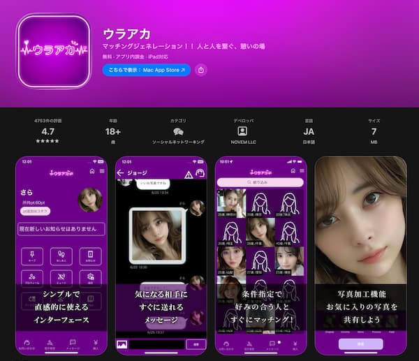 ウラアカは、普段の日常では接点のない世代や価値観の人と交流できるとされるチャット系の出会いアプリだと紹介されているね。