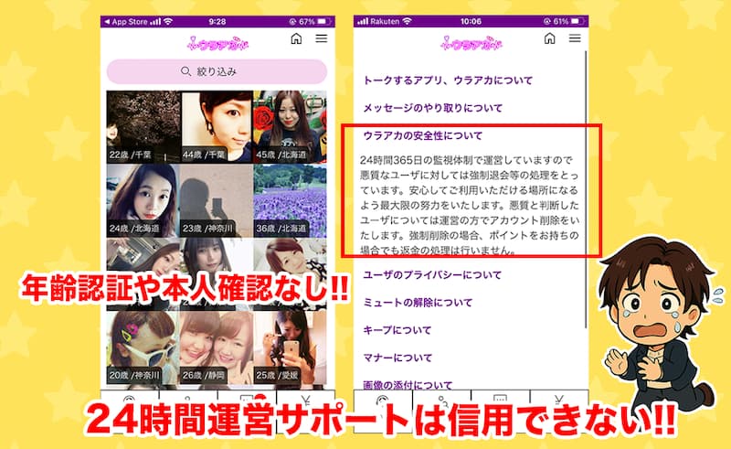24時間365日の監視体制があるから、迷惑系のユーザーを削除しているように書かれているけど、安心安全をうたう運営が無届けで年齢認証すらもないことは、まずあり得ないと俺は思うね。
