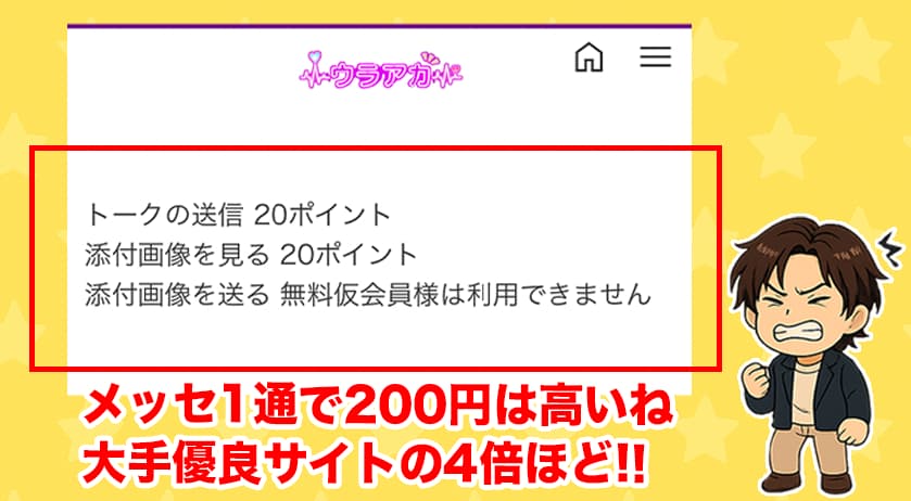 また、改めてだけどウラアカの料金は、メッセージを送信するたびに200円のポイントが必要になる。