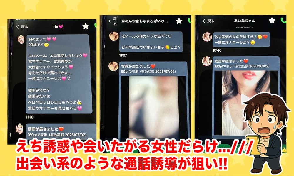 こっちからアプローチしてみると、最初の会話は自然に始まるんだけど、結局は通話や動画像のやり取りに持っていきたがる流れが目立ちました。